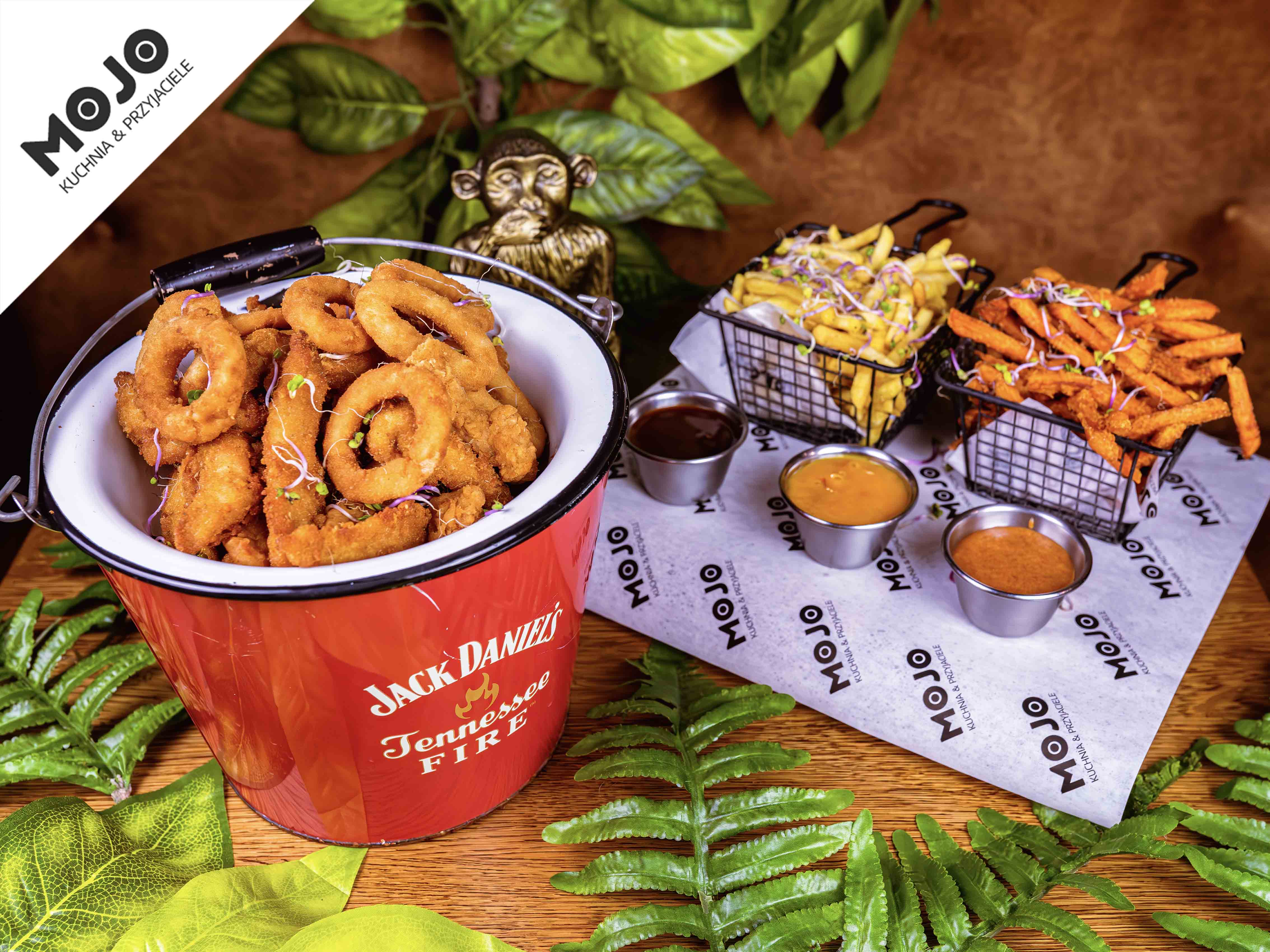 stripsy z kurczaka w panko / stripsy z kurczaka Kentucky / frytki / frytki z batatów / krążki cebulowe / sos mango-chili / sos BBQ / sos Kentucky / chipotle mayo