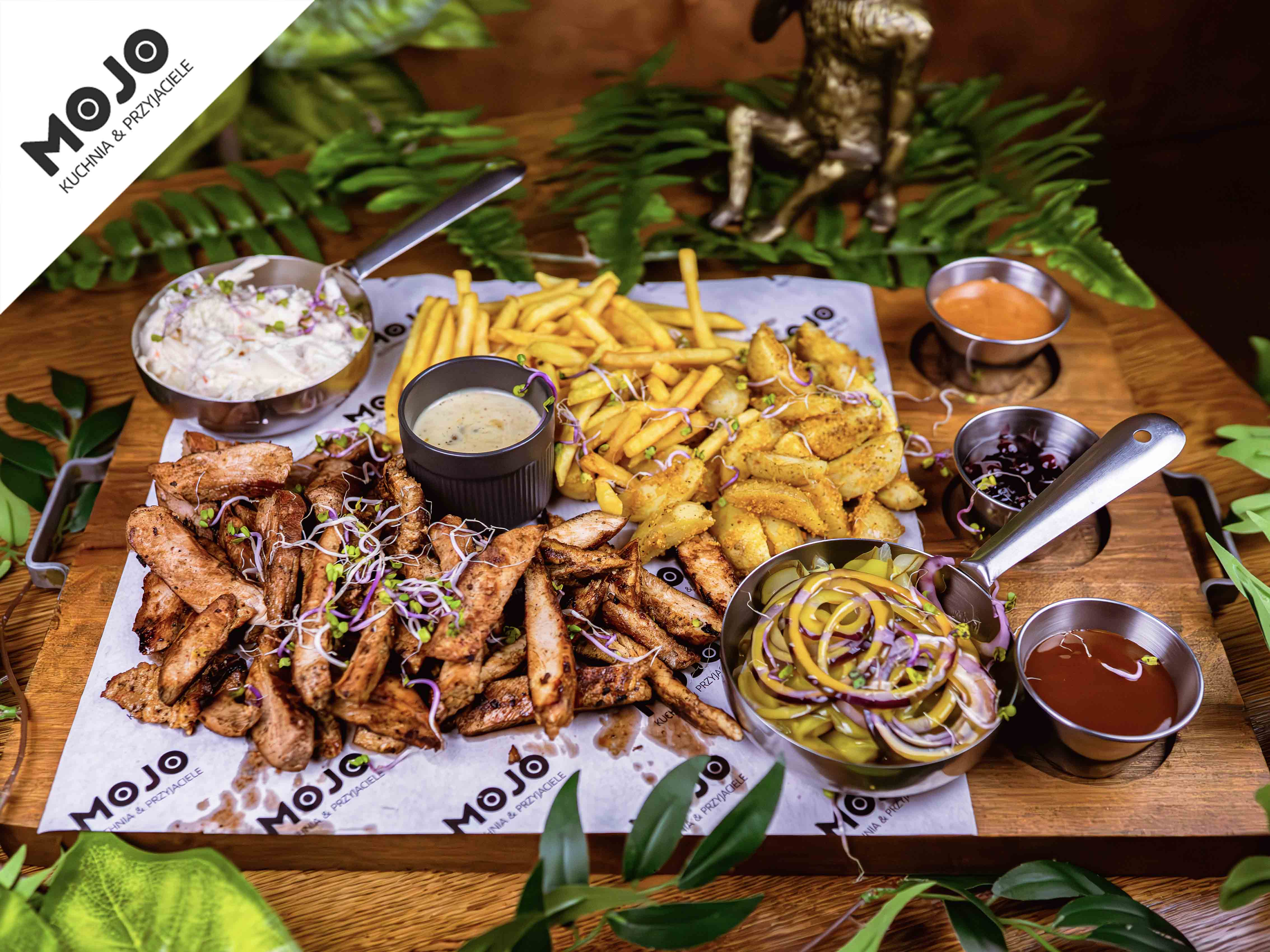 6 x mini tortilla / szarpana wieprzowina / stripsy z kurczaka / chili con carne / jalapeño peppers / duszone chorizo / frytki z batatów / nachosy / guacamole / 2 x sos aioli
