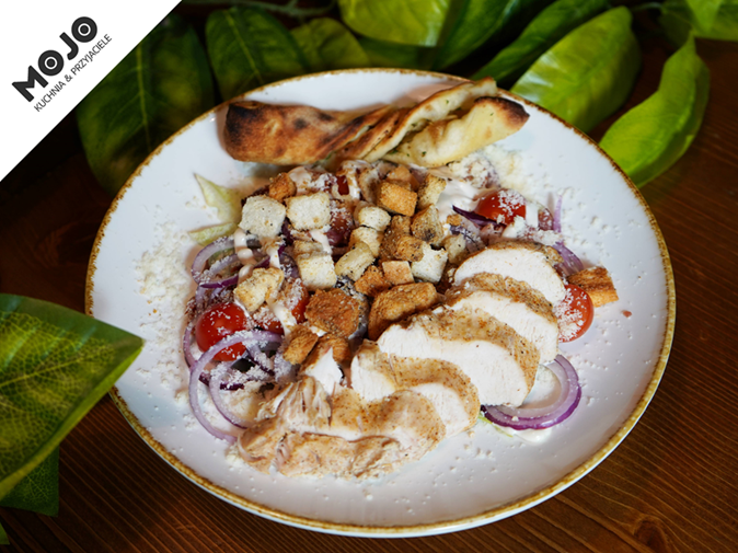 mix sałat / kurczak / bekon / pomidorki koktajlowe / czerwona cebula / grzanki / parmezan / sos Cezar / pieczywo