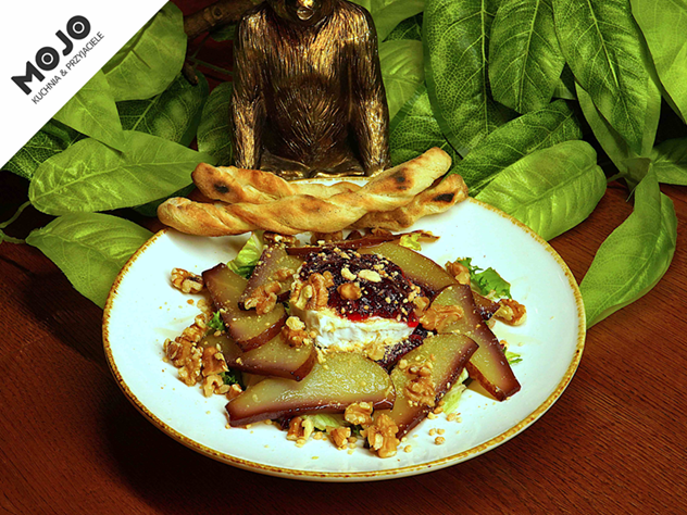 mix sałat / ser kozi / gruszka / orzechy włoskie / żurawina / miód / oliwa ziołowa / pieczywo