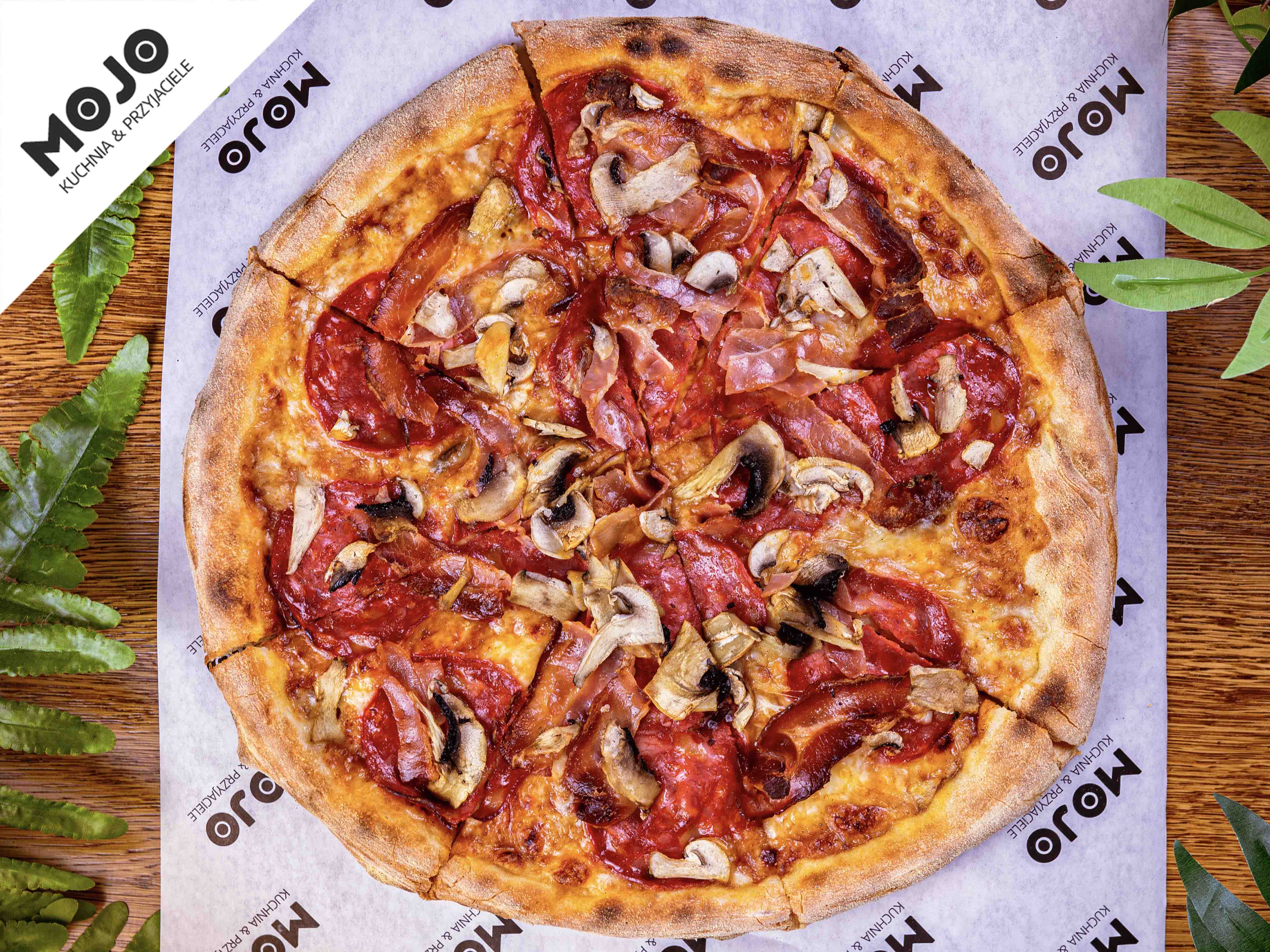 sos BBQ / mozzarella / boczek / chorizo / pieczarki