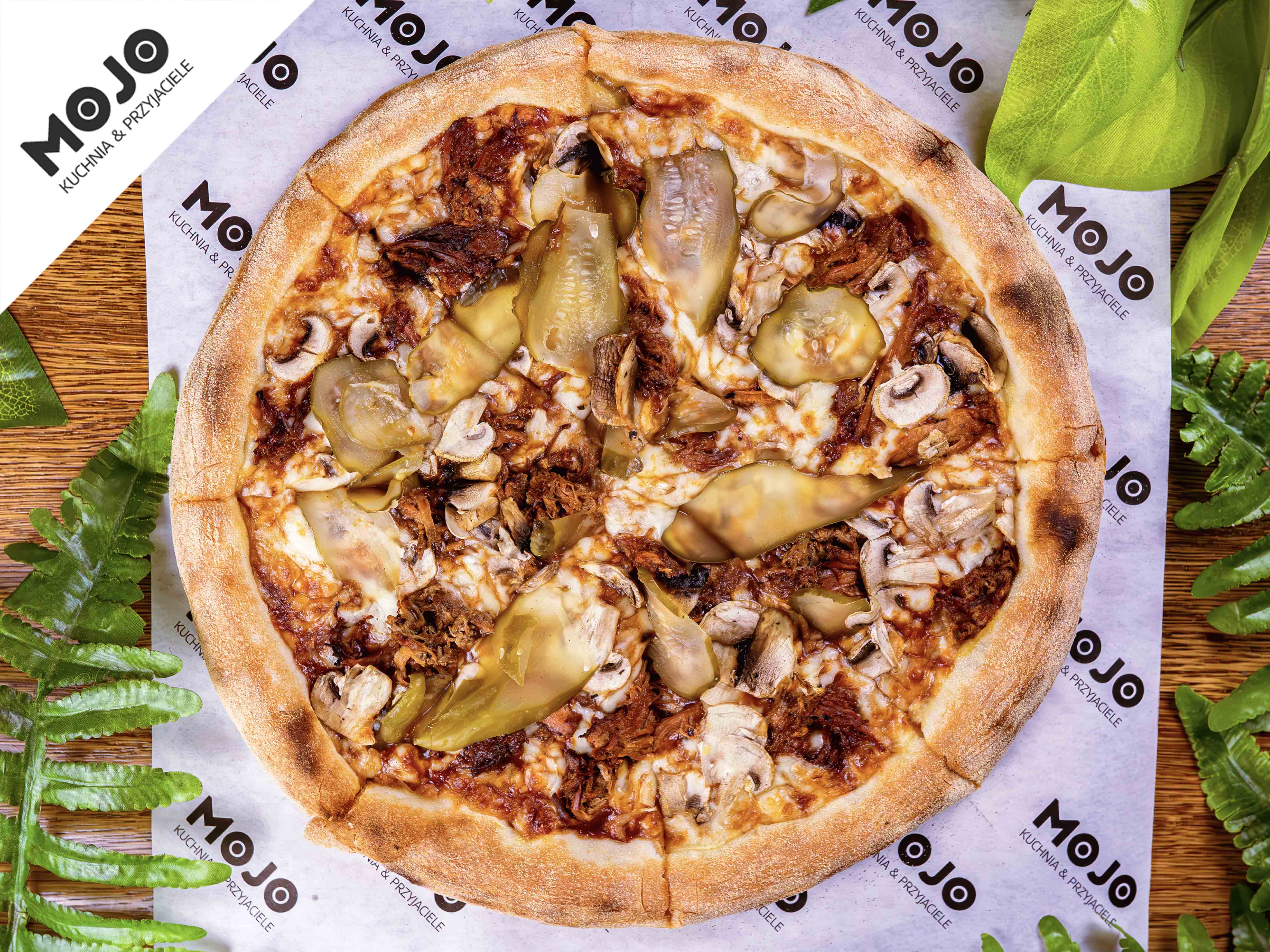 sos BBQ / mozzarella / szarpana wieprzowina / pieczarki / ogórek kiszony