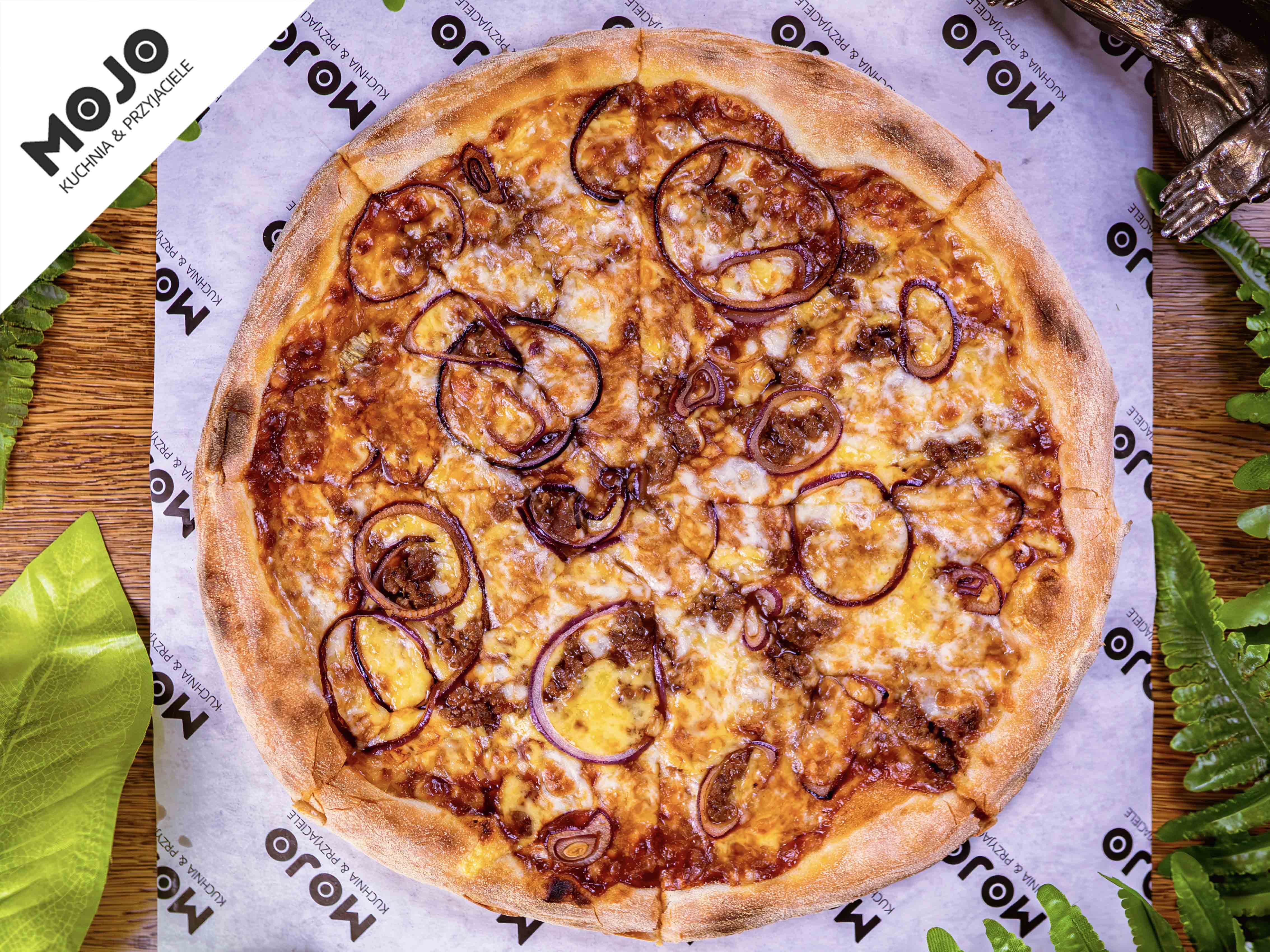sos BBQ / mozzarella / cheddar / wołowina / czerwona cebula