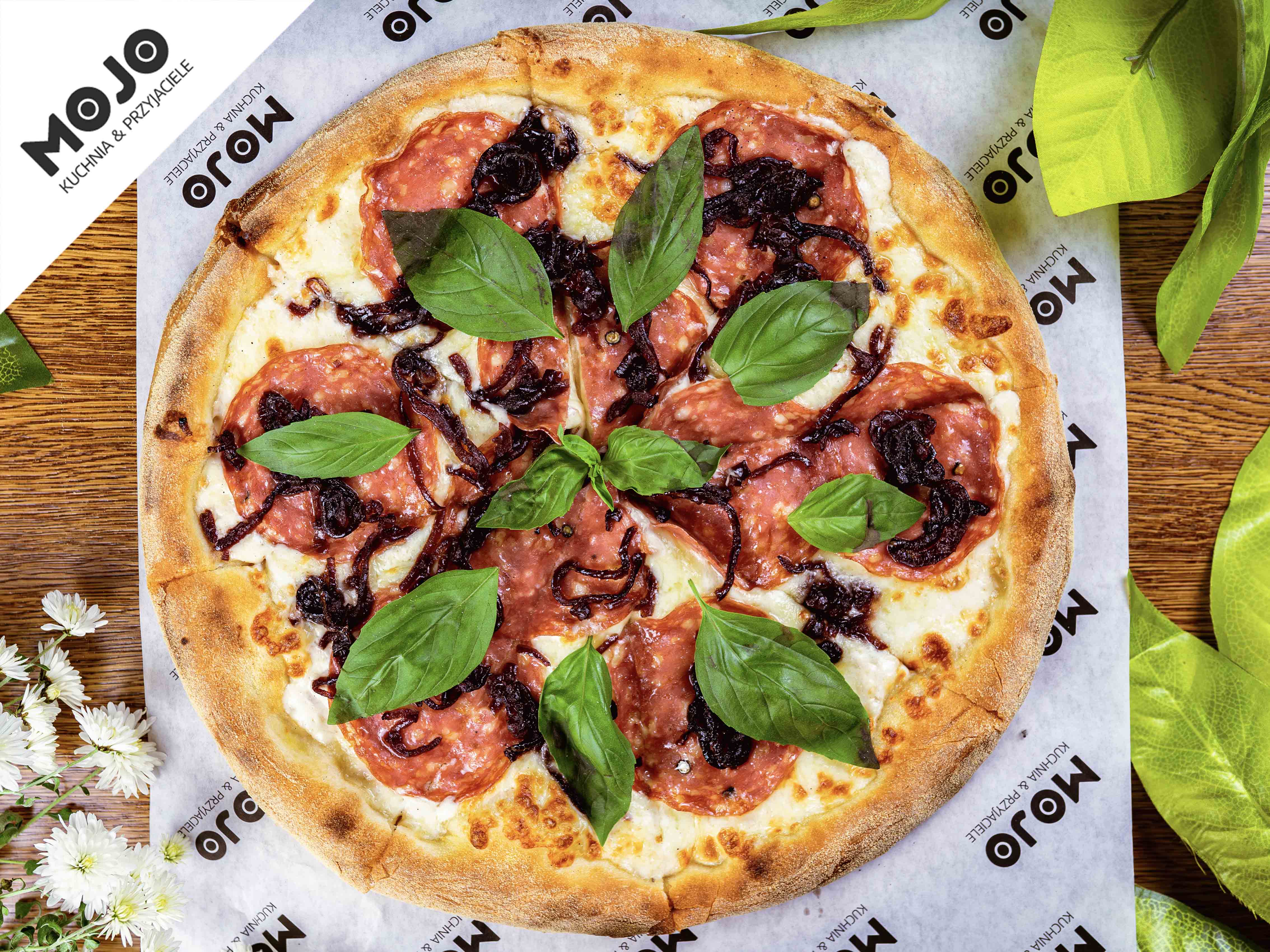 Sos Cezar / mozzarella / salami napoli / karmelizowana cebula / bazylia
