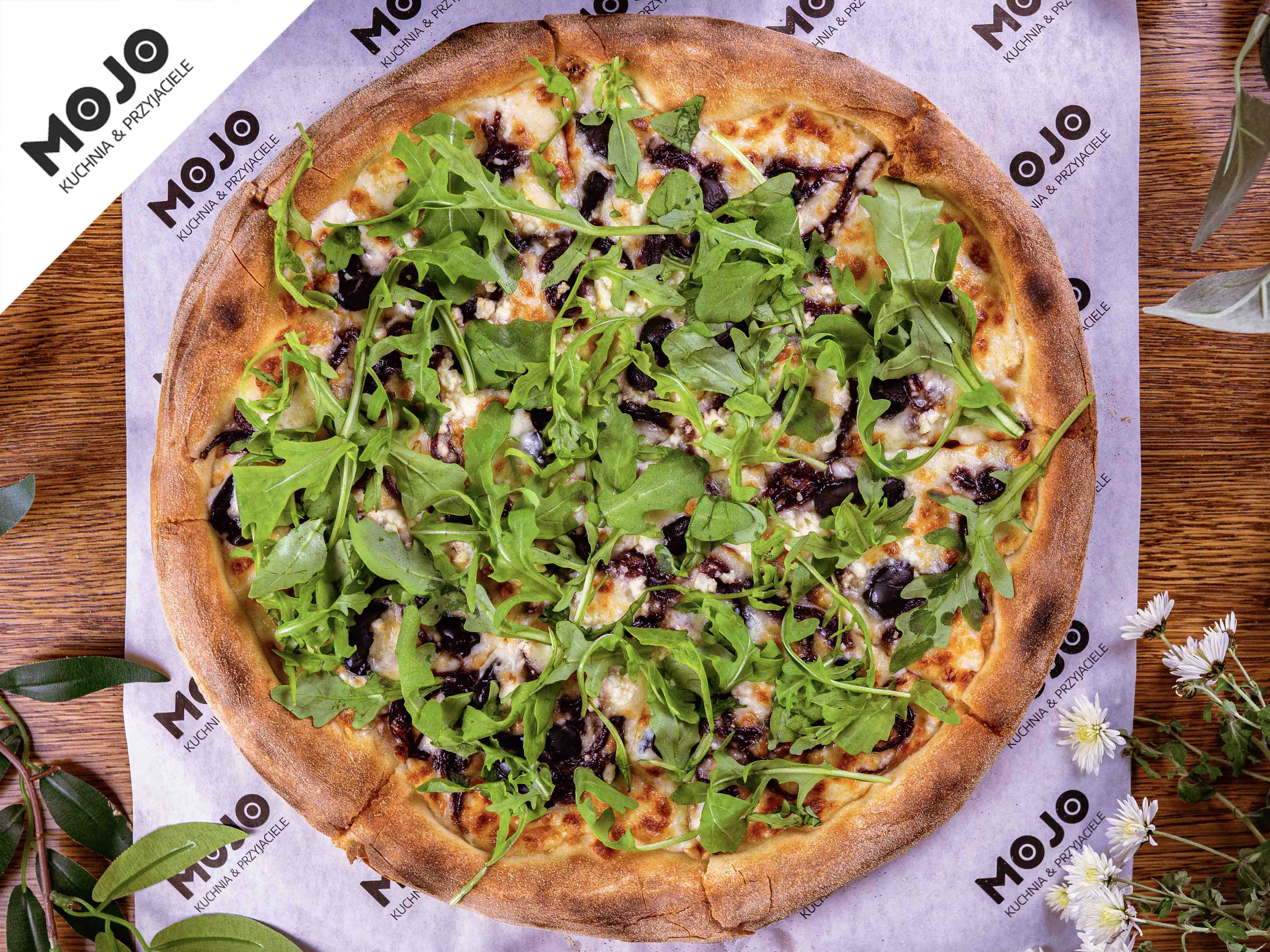 sos Cezar / mozzarella / ser feta / czarne oliwki / karmelizowana cebula / rukola